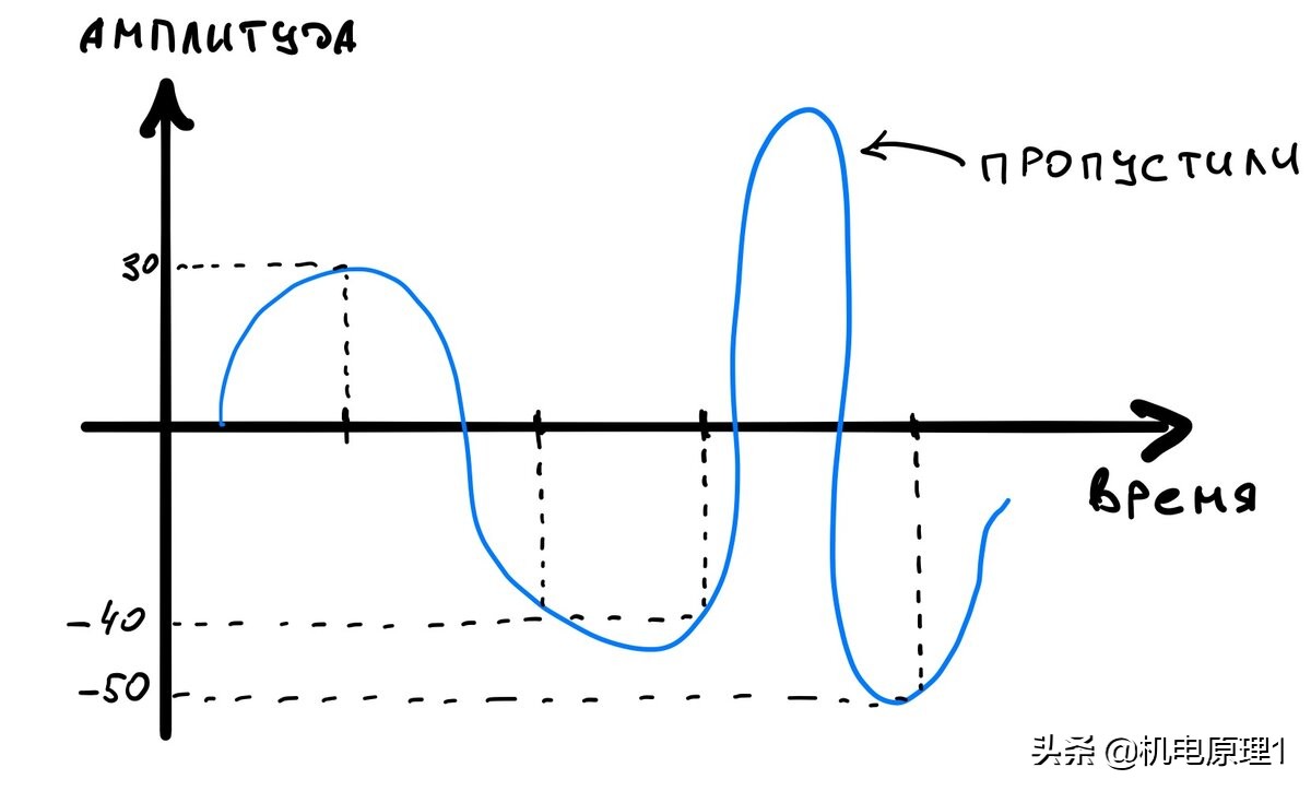 我們測量了四個點中每個點的幅度值,相對而言,收到了四個數字:+30、-50、-50 和 -60。從理論上講,如果我們透過電流並將這四個電壓施加到揚聲器上,我們將能夠再現相同的聲音。但是有幾個問題: