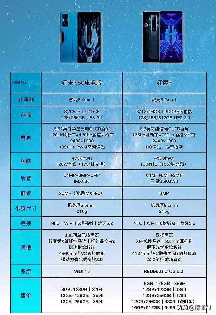 開年各品牌遊戲手機,就開始陸續釋出,K50對標紅魔7,價格相差900,K50 3299元,紅魔3999元