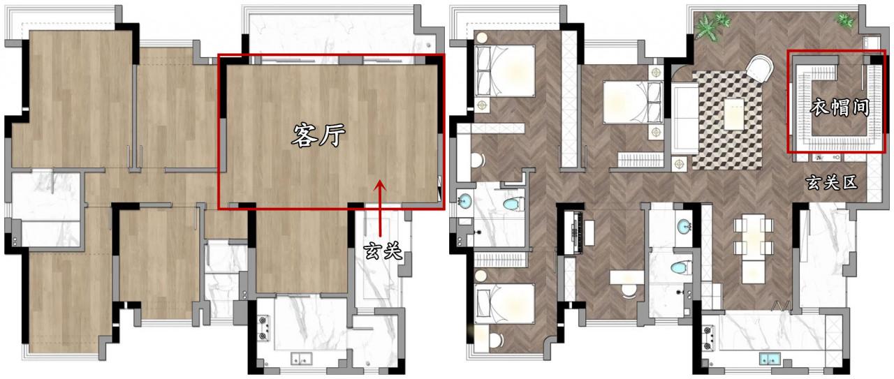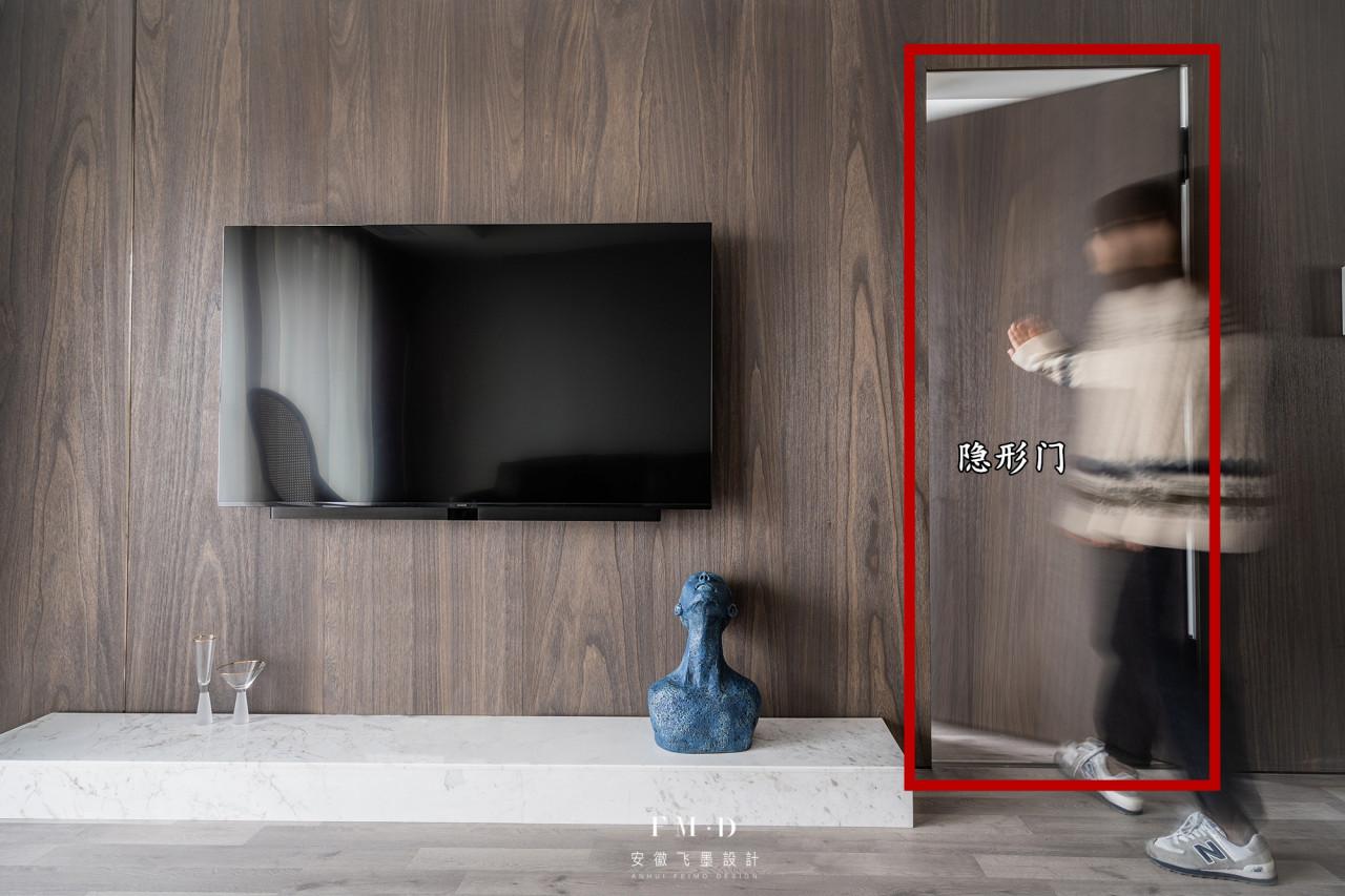 至於隔開小房間的門要怎麼處理呢?正對著客廳又有些尷尬,像臥室和衣帽間這類私密性的空間,可以保留陽臺方向的門即可。當然了,也可以設計成雙門設計,整體形成洄游動線,不過電視背景牆上的門建議設計成隱形門,整體感好又不會尷尬。