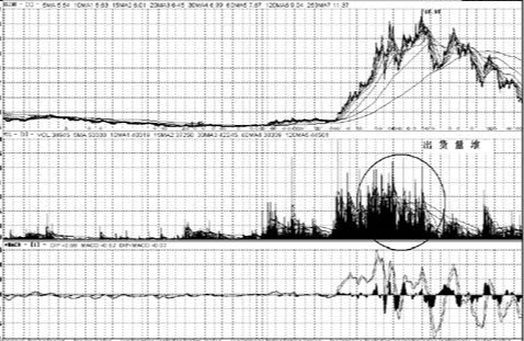 “量堆”也屬於放量的一種表現,只不過它屬於持續放量,並以“大量”或“巨量”為主,因此它也多出現於股票的“建倉期”、“突破期”與“出貨期”。