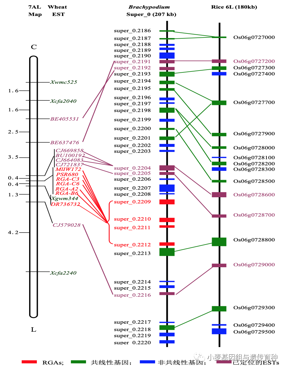 之後韓俊博士在攻讀博士學位期間(2006.9-2009.6)利用當時僅有的小麥EST序列和剛剛釋放的二穗短柄草基因組測序Scaffold序列以及水稻的基因組序列對MlIW172對應的基因組區段開展比較基因組學分析,利用短柄草的Scaffold序列和小麥的EST序列開發多型性分子標記,對MlIW172進行比較基因組學定位,將MlIW172定位於一個RGA基因簇中(圖4)。