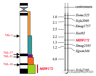 與當時定位於該染色體區域的其它抗白粉病基因進行連鎖圖譜比較分析,結果表明MlIW172與Pm1、來源於烏拉爾圖小麥的PmU(Qiu et al. 2005)、來源於栽培一粒小麥的Mlm2033和Mlm80(Yao et al. 2007)均位於7AL染色體同一區域,推測它們可能是復等位基因,或者是7AL的該區域存在一個抗病基因簇(宋偉 2007)。