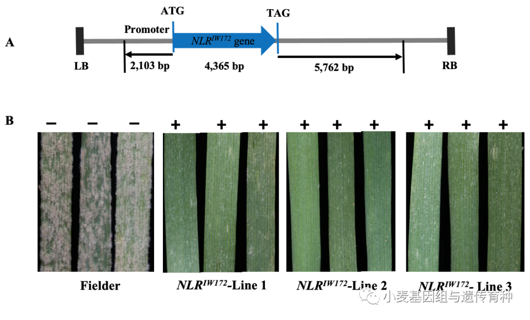 為進一步驗證該NLR的抗白粉病功能,構建了該NLR自身啟動子驅動的NLR基因組序列轉基因載體,透過農桿菌介導的方法遺傳轉化高感白粉病小麥品種Fielder,獲得4個含有目的基因的轉基因T1代家系,其中的轉基因陽性苗表現高抗白粉病(圖8),證實了該NLR為MlIW172的功能基因,是Pm60基因在野生二粒小麥中的一個新等位基因。