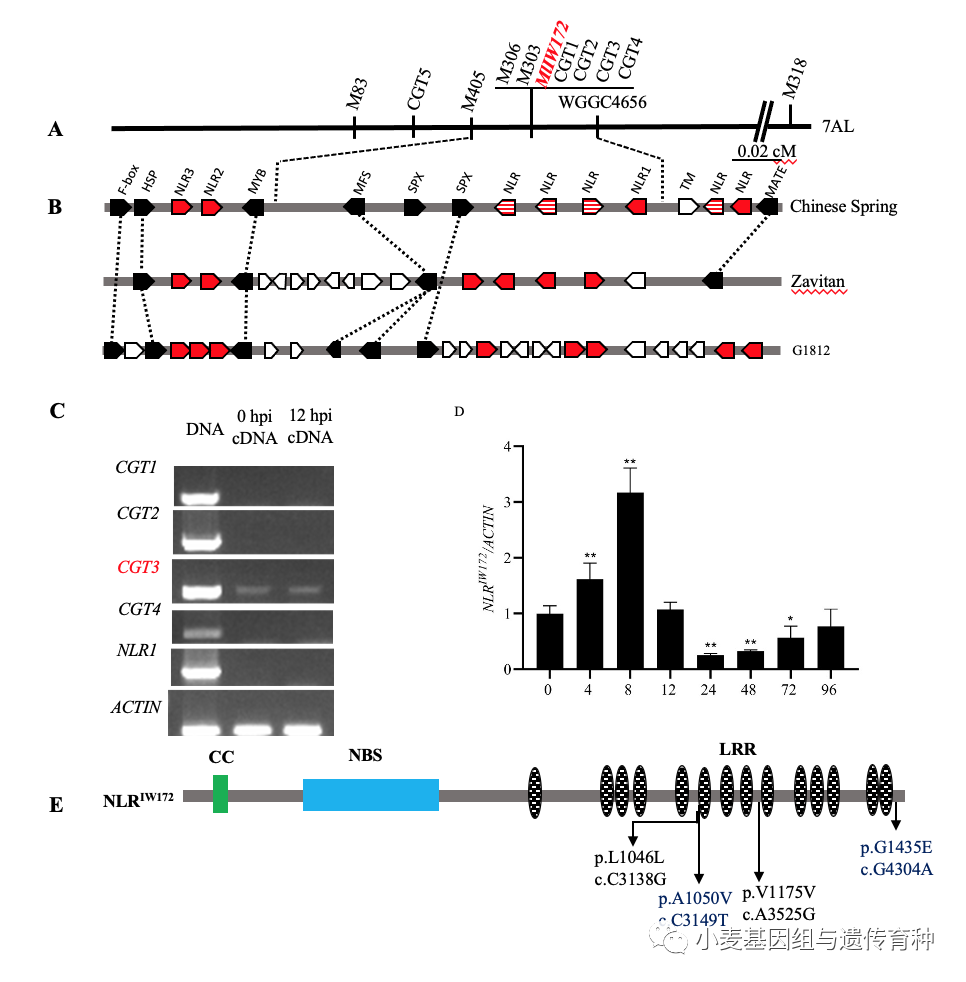 RT-PCR結果表明這些NLR序列中只有CGT3相關的NLR基因在白粉病菌接種前後均表達(圖6C),且該基因在接種E09後8小時有顯著的表達上調(圖6D)。該基因編碼一個典型的CC-NBS-LRR蛋白,含有1454個氨基酸,與已克隆的來源於野生二粒小麥抗白粉病基因MlWE18間存在4個SNP,其中2個導致氨基酸序列變異(圖6E);與烏拉爾圖小麥中的Pm60基因相比存在9個SNP,其中3個為非同義氨基酸變異。據此推測,IW172中的這個NLR可能是Pm60和MlWE18的功能等位基因,因此進行了後續的功能驗證。