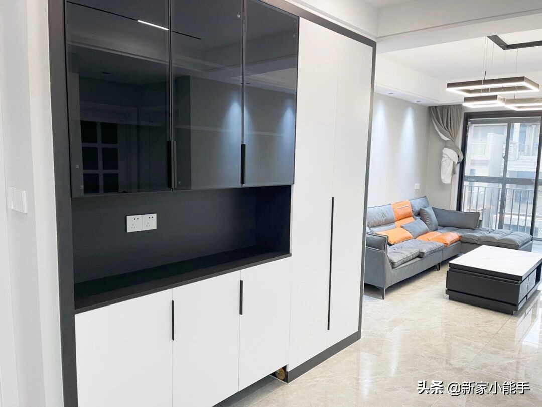 櫃子分為上下兩層,中間留空位置,可以放一些常用的東西。而偏灰色與白色搭配,顯得比較協調,我們更多的年輕人會喜歡。定製的櫃子直接到頂,半點空間都沒有浪費,很實用哈。