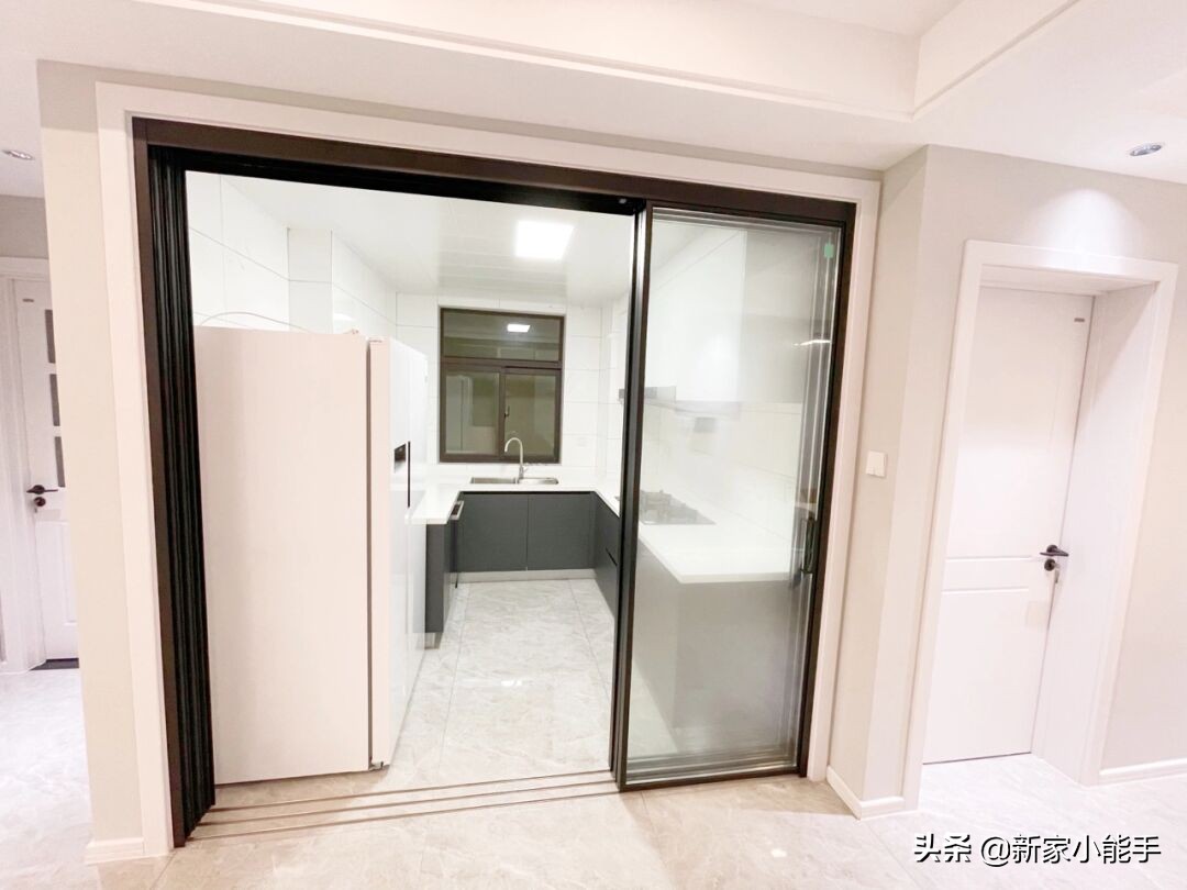 廚房安裝了黑色邊框透明玻璃門,可以透過玻璃看到廚房裡面,顯得空間比較寬敞。安裝的是吊軌,下面是沒有軌道的,做保潔的時候更方便呢。