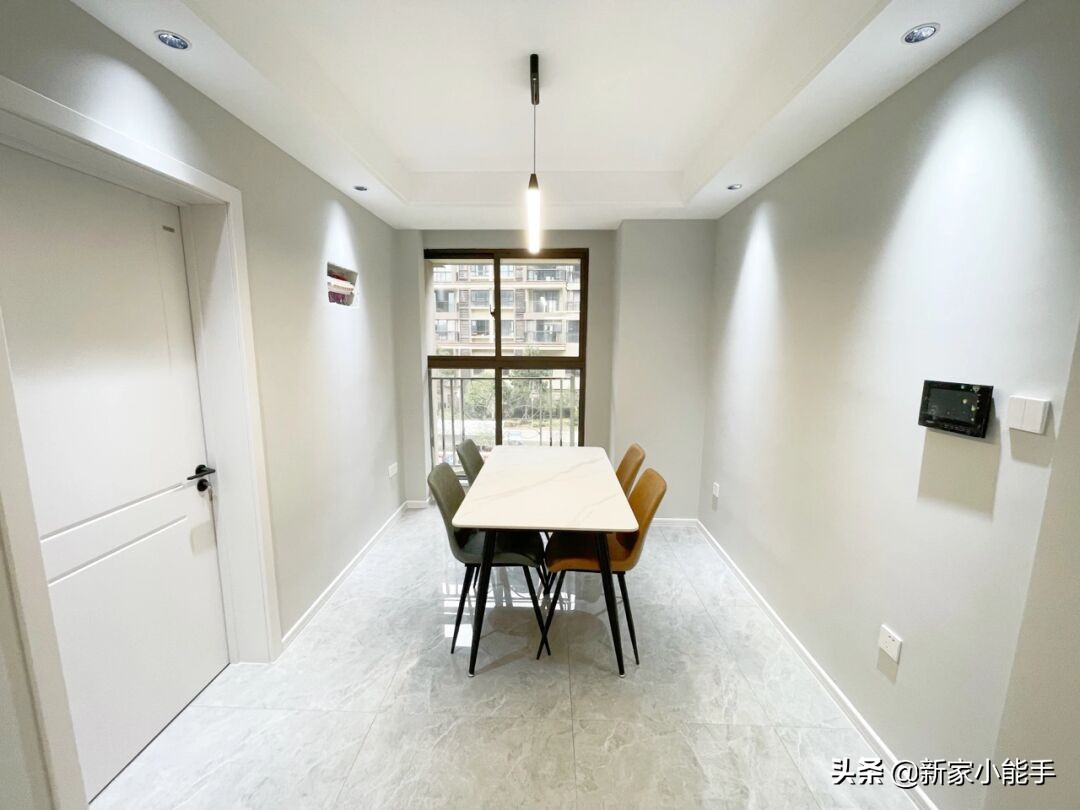 餐廳佈置了一張方形餐桌,佔用的空間都大小位置合適,巖板的材質,很有質感,看著有點類似大理石的感覺,真心不錯呀