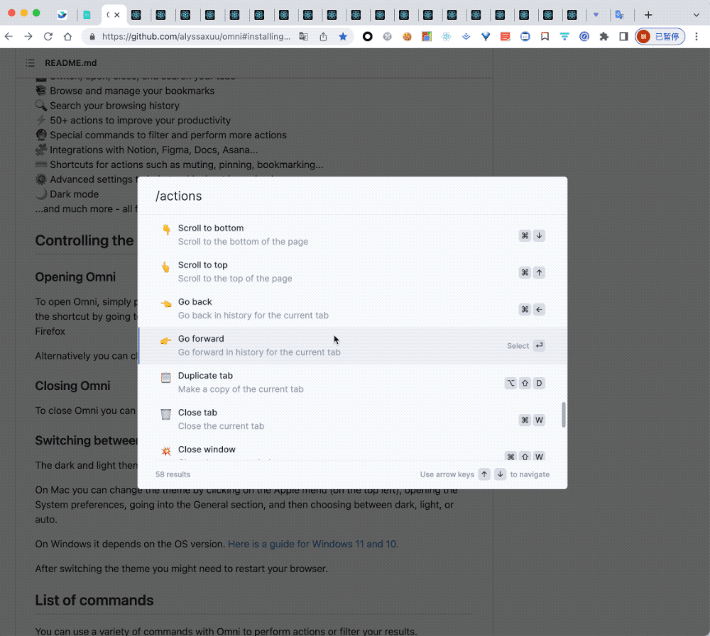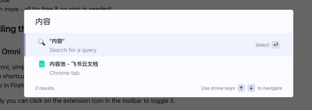 但是 Omni 卻在瀏覽器中實現了類似 Mac 的的 "聚焦搜尋" 一樣的功能, 透過快捷鍵 Command/Ctrl + Shift + K 就能撥出一個類似這樣的選單:
