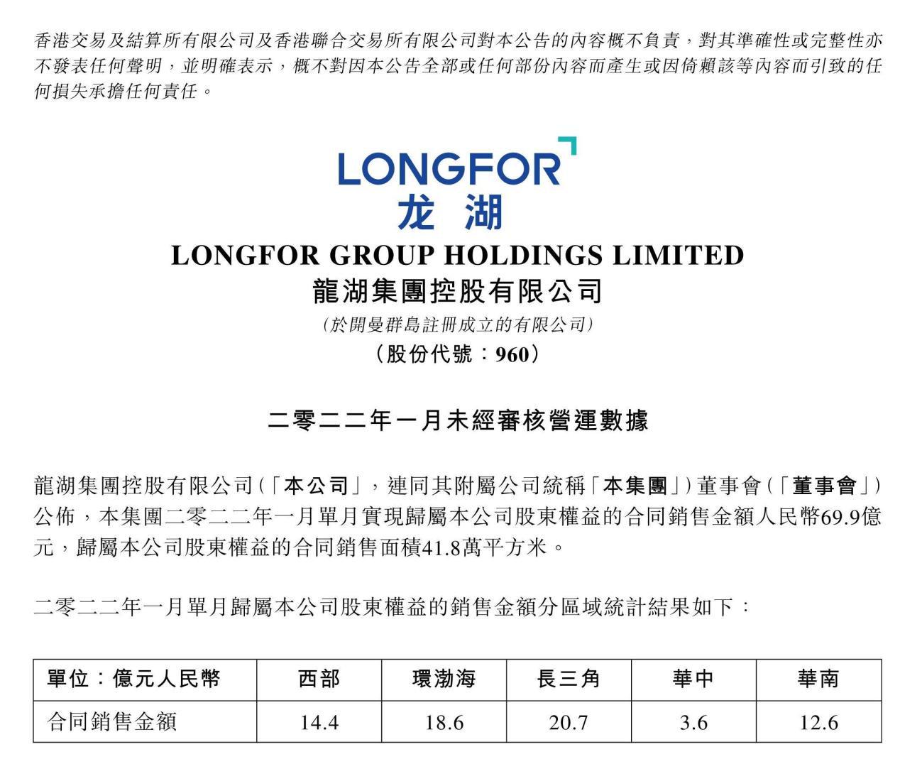 2月11日晚,龍湖集團(HK:00960)釋出2022年1月未經稽核營運的資料公告。公告稱,龍湖集團2022年1月單月實現歸屬本公司股東權益的合同銷售金額人民幣69.9億元,歸屬本公司股東權益的合同銷售面積41.8萬平方米。