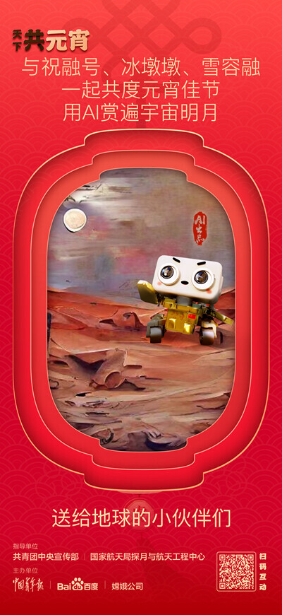 祝融火星車是“天下共元宵”網路公益傳播活動的“神秘嘉賓”之一。當日,在共青團中央宣傳部、國家航天局探月與航天工程中心指導下,中國青年報社聯合百度公司、嫦娥奔月航天科技有限公司、安踏集團發起了這項活動,微博提供傳播支援。在“天下共元宵”頁面,海內外網友可在AI(人工智慧)技術輔助下,一起繪製有關月亮的畫作,向親友送出元宵卡,在網上共度元宵佳節。