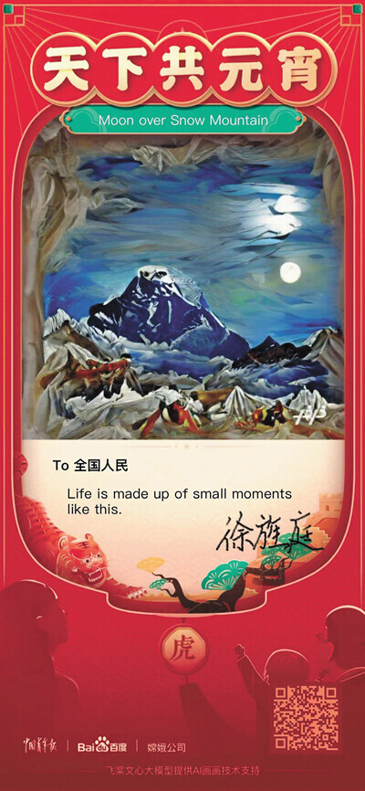 嚴格意義上來講,這一幅幅月亮圖不是由人類繪製的——參加者只需在“天下共元宵”活動網頁中輸入想看月亮的地點和要送給的人,AI可以在幾秒鐘之內完成一幅畫作,還可以憑藉語言生成能力即興“賦詩一首”。
