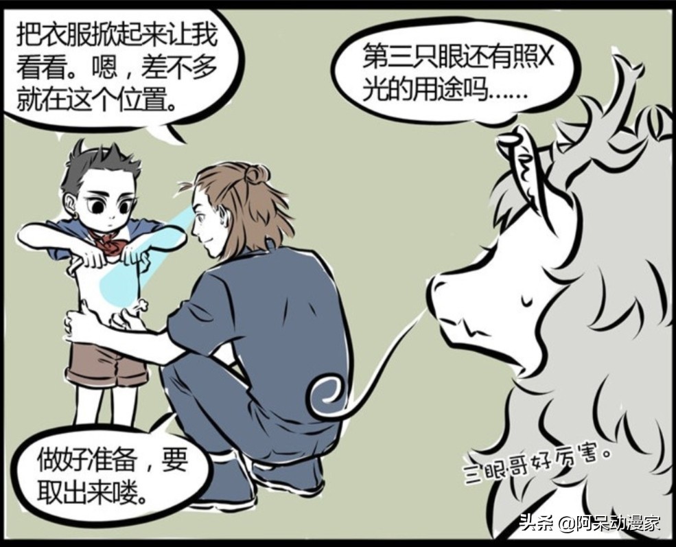 哪吒掀開自己的上衣給楊戩展示。告訴他大約的位置。原來楊戩的第三隻眼睛還能做X光。這用途可真是好啊。就在這時,楊戩準備幫哪吒取出肚中的龍珠。