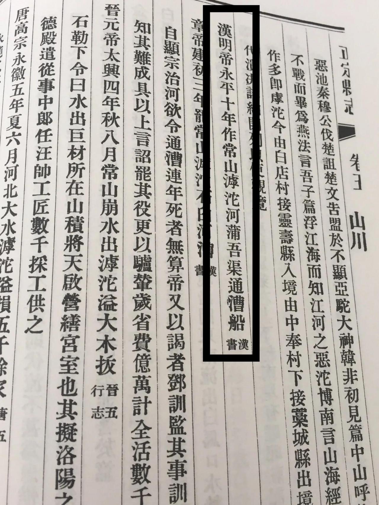 漢明帝永平十年,在常山郡滹沱河開鑿蒲吾渠以通漕運。漢明帝即劉秀的四皇子東海王劉陽,在太子劉彊力辭太子之位後接任太子,改名劉莊,後來繼承了劉秀的皇位即漢明帝。《河北通史·秦漢卷》也證實了這一史實,“永平十年(67年),修治常山滹沱河蒲吾渠,以通漕船”。這時距劉秀建立東漢已四十多年了。