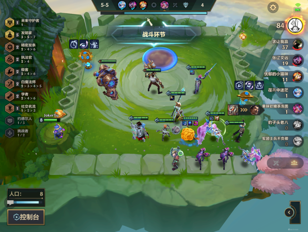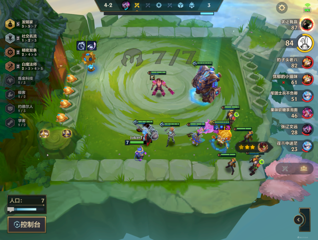 7人口必開5發明,沒有風女和發條就用寶石+冰女替代即可,5發明一定要開,前期的EZ以及鍊金切記留好,不然7人口湊不到就尷尬了,開出5發明之後卡利息慢慢找大頭3星即可,不用著急上8人口找議員,議員1星抗不住的。