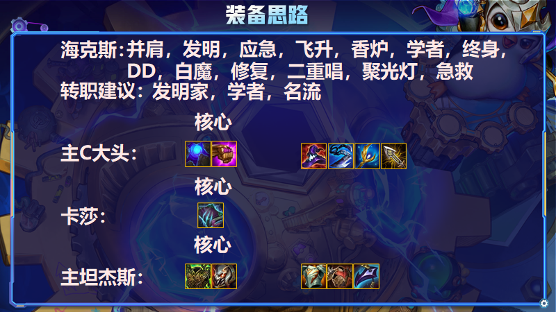 開局搶眼淚,優先找藍BUFF+法爆,湊齊大頭裝備後下一件最佳是鬼書,大頭第三件看野怪裝備合即可,不是特別挑第三件,其次前期推薦約德爾連勝,3約+機器人質量上來的話是可以博連勝的,大頭沒來之前,裝備給卡牌/螞蚱/小炮/炸彈人打工均可,視情況而定,其次如果開局3發明的話那就是穩定連勝了,就要等6人口再吃約德爾,3發明開局的話千萬不要自降戰力吃約。