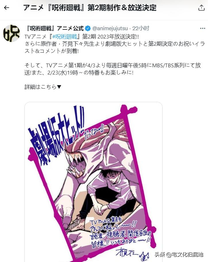 動畫的官推同樣發表了訊息,並附帶了一張芥見下々繪製的插畫。上面寫的是“聽說劇場版大受歡迎哦”下面的文字是“TV動畫的第2季也已經開始製作了,原作漫畫的讀者朋友,觀看動畫的觀眾朋友,還有各位相關的製作人員,謝謝你們一直以來的支援——芥見下々。”
