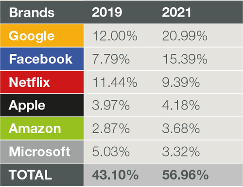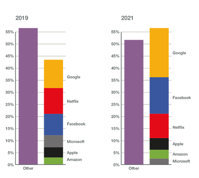圖:全球Top網際網路公司的網路流量在新冠疫情期間佔據一半以上。來源:Sandvine。