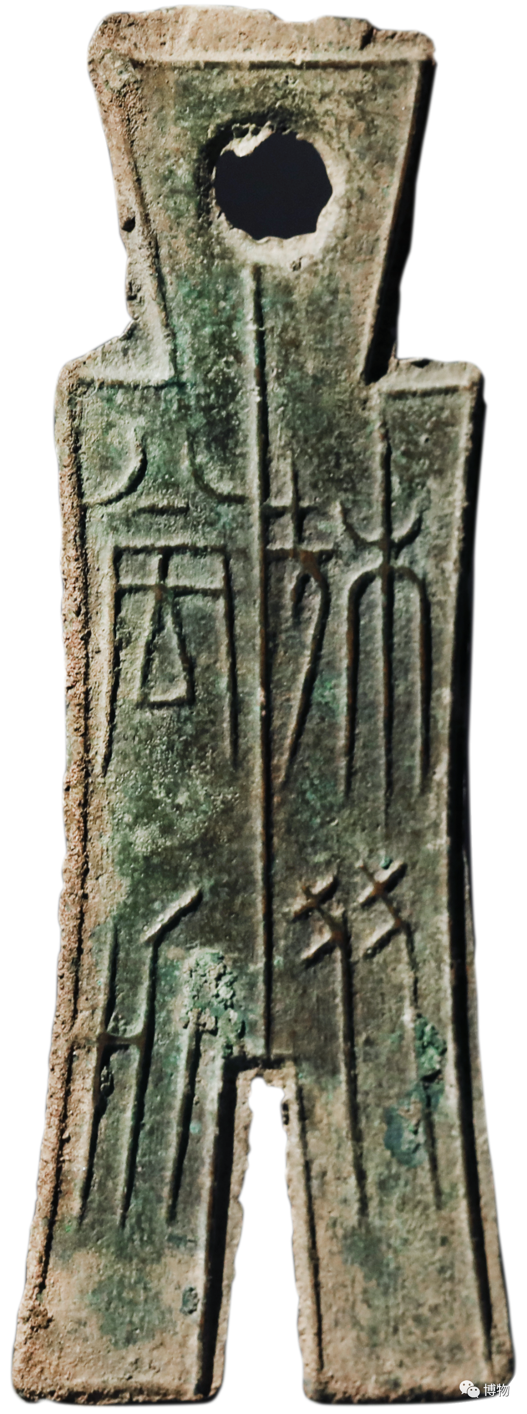 楚國銅貝正面有紋飾,但不再模仿海貝腹面的溝齒紋路了,而是刻著神秘的符文。其中有90%以上形似漢字“咒”。那兩隻“眼睛”再配上正面尖端的圓孔(坑),看上去像是張驚恐的人臉,故而民間常稱之為“鬼臉錢”。今日對它們的正式稱呼,就是“蟻鼻錢”。