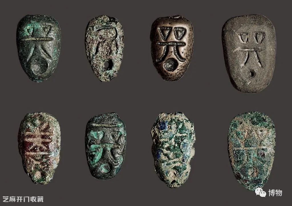 關於蟻鼻錢上的符文,學界有好多種猜測,主流觀點認為上面是文字。最多的“咒”字文,筆者認為與“貝”字在金文中的寫法相近,很可能就是楚國的“貝”字。目前出土發現的還有十幾種不同錢文,形似“紊”“金”“君”“行”“忻”“匐”“朱”“三”等字,但其中的含義至今仍是未解之謎。