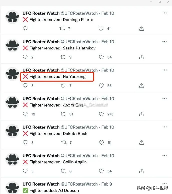 格鬥世界訊:近日疑似中國大級別綜合格鬥選手胡耀宗被美國終極格鬥冠軍賽(UFC)解僱,訊息已經發出變引發格鬥世界的關注,截止目前還沒有得到其本人和UFC中國官網正式回應?