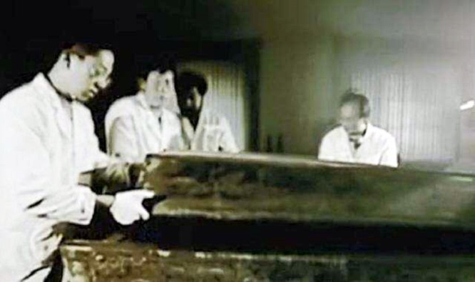 結束了現場勘查的考古隊回到了實驗室,一眾工作人員繼續研究安放在此的兩副棺槨。工作人員先是打開了那副更大的長達兩米的棺槨,開棺以後便看見了很多的棺液充斥在其中。