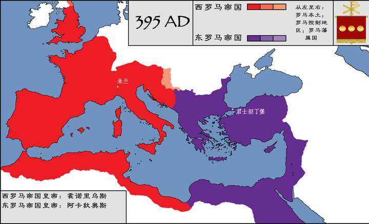 公元395年,羅馬帝國的皇帝狄奧多西一世駕崩,將羅馬帝國分給兩個兒子分別繼承,從此羅馬帝國正式分裂為東西羅馬。但是,這兩個羅馬正式的國名還是一樣的,一直在沿用:元老院與羅馬人民。