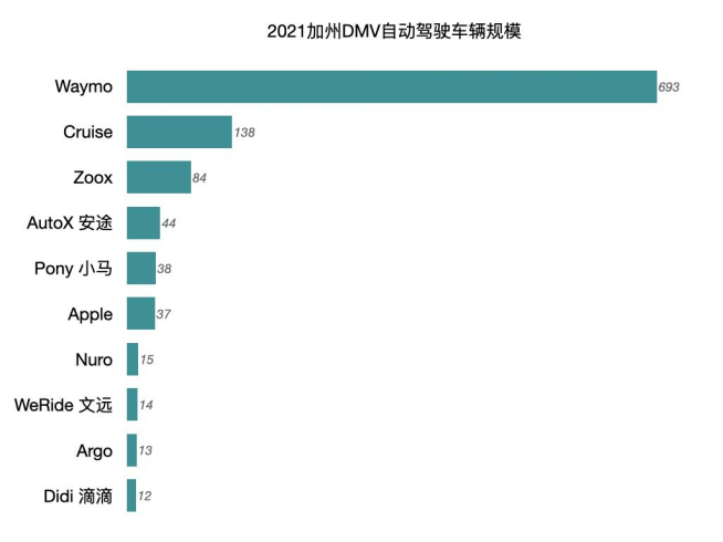 在2021年加州DMV自動駕駛車輛規模榜單中,自動駕駛領域鼻祖Waymo以693輛的優勢遠超榜單上其它的自動駕駛公司,即便是位居第二名的Cruise也與其有著多達555輛的巨大差距。