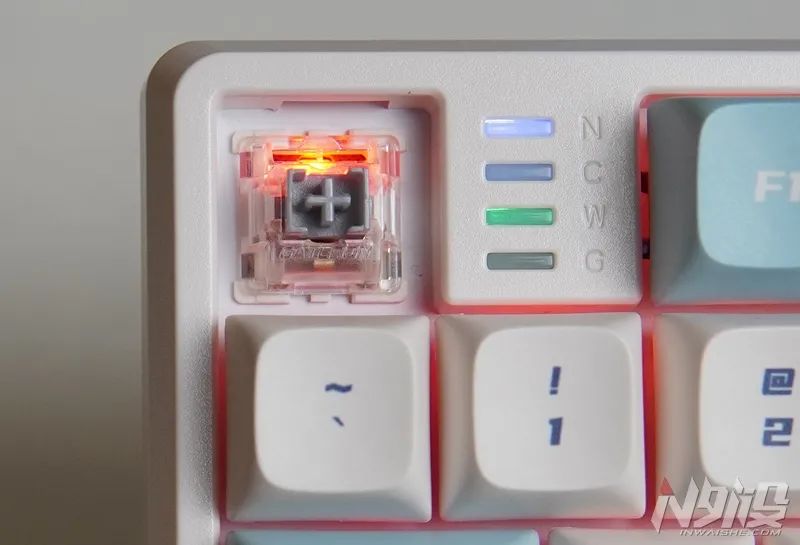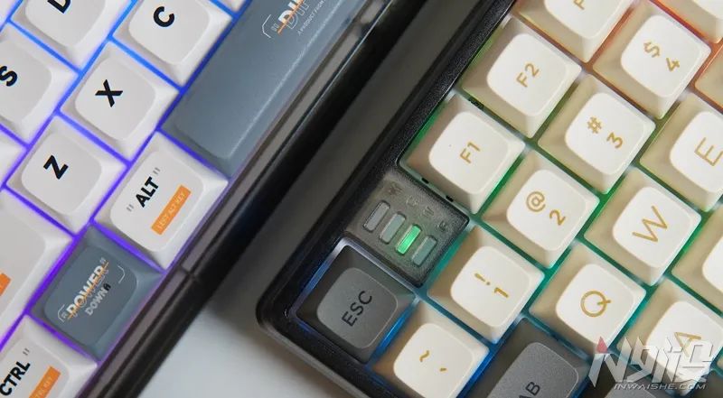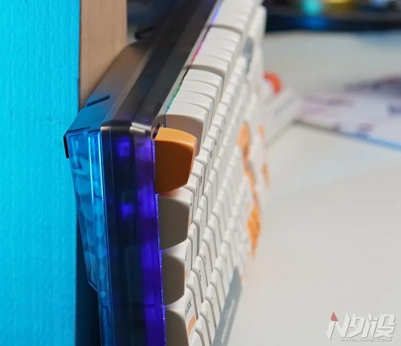 外觀細節方面,三模版可以說和有線版有99%的相似度,剩下那1%就是底部的兩個開關。以微光款為例,此前曾體驗過的有線版為黑色外殼,手上這把鍵盤升級為了黑色半透外殼,Gulf Racing則是米白色的外殼,不透,純粹為了貼近鍵帽顏色,而且右下角“Darmoshark”的字元也並非是黑色的,而是深藍綠色,比Gulf Racing主題鍵帽字元色還要深。