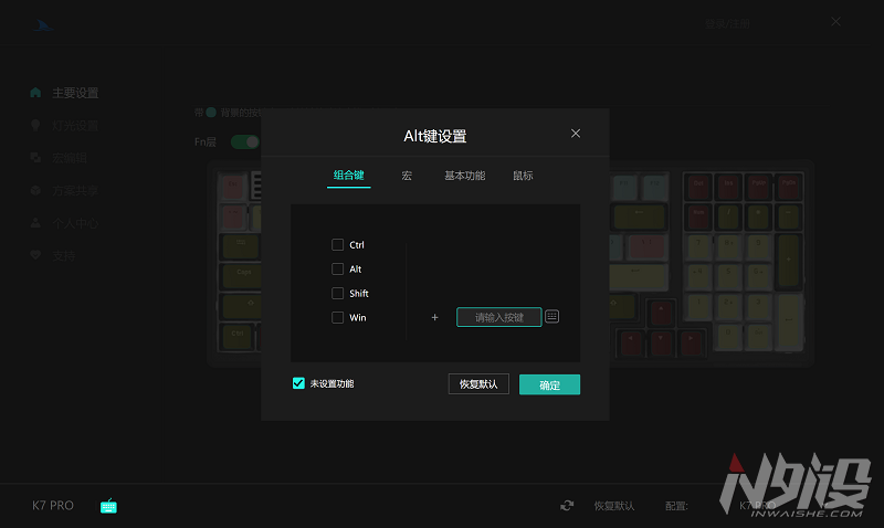 K7 Pro的驅動不同於K7有線版,看起來要更直觀簡潔,也要比舊版更加容易上手。傳統的Fn層還在,編輯時會有提示,操作很友好。燈效設定那倒是和K7有線版的一樣,具備了不錯的可玩性和自定義功能。但是驅動還不能正確識別Gulf Racing和AJ版本,無法在主介面展示鍵盤型號,只展示了一個微光款式,等日後更新吧。