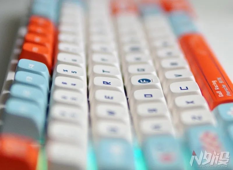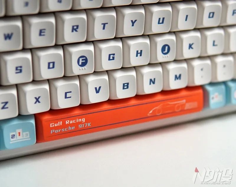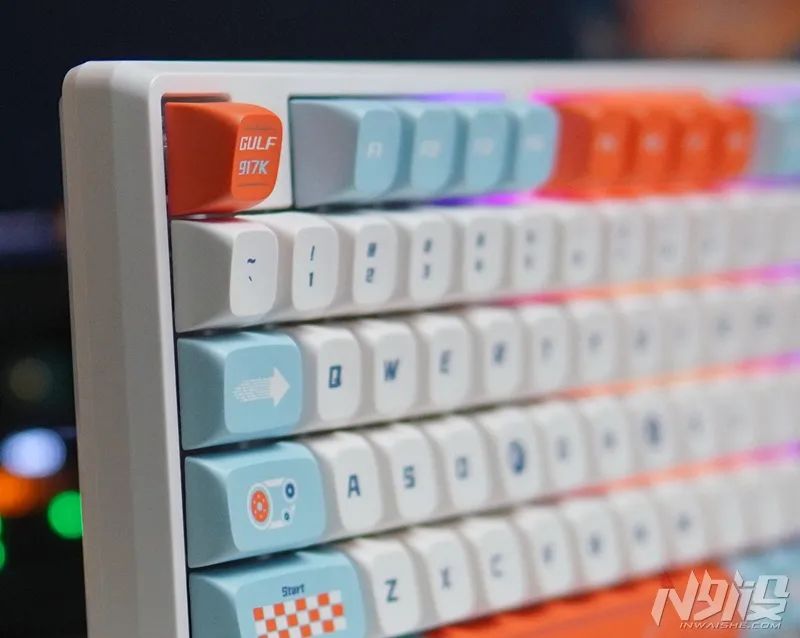 鍵帽分了兩個高度,微光是平胸的XDA高度,一切照舊。Gulf Racing和AJ款為帶弧度的KDA高度。特別是Gulf Racing主題,Gulf Oil作為最早參與賽車贊助的石油品牌之一,其天藍色+橙色的搭配已經成為了保時捷917最具代表性的塗裝。而這套指尖文創出品的Gulf Racing主題鍵帽就是基於Gulf Racing,以活潑,高對比度和個性鮮明為特點,為不少玩家熟知。另一個AJ款,配色方案靈感來自Nike AJ,主題色也完美還原了那款AJ鞋的黃白灰三色,甚至在BackSpace鍵上還有“DON’T TOUCH”這種黑色幽默元素。製作工藝方面,Gulf Racing和AJ是熱昇華,原來的微光還是二色,而且前兩者的鍵帽厚度要大於後者。不單隻高度不同,相較微光款平坦的表面,Gulf Racing和AJ鍵帽的弧度都要更加明顯。觸感也以為工藝不同而有所不同,至少仔細體驗還是能感受到微光二色鍵帽凸起的字元。所以論順滑度,用熱昇華的這兩款聯名鍵帽要更勝一籌。由於三者都是光滑表面,在燈光照射下會有漫反射效果。