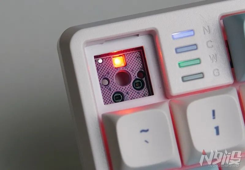 K7全系列皆支援熱插拔,拔出軸體後可以看到定位板和PCB之間的隔音棉,熱插拔方案和有線版一樣,支援三腳五腳軸體。