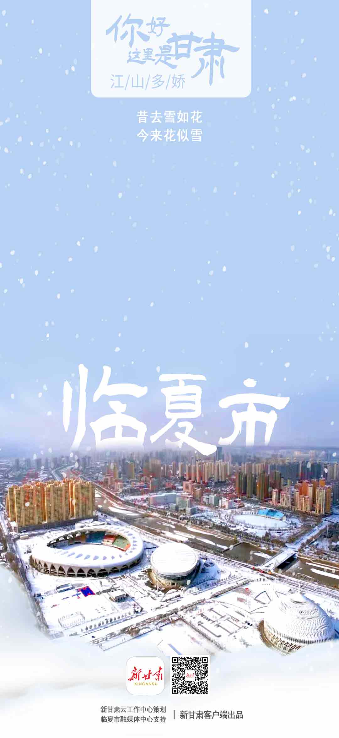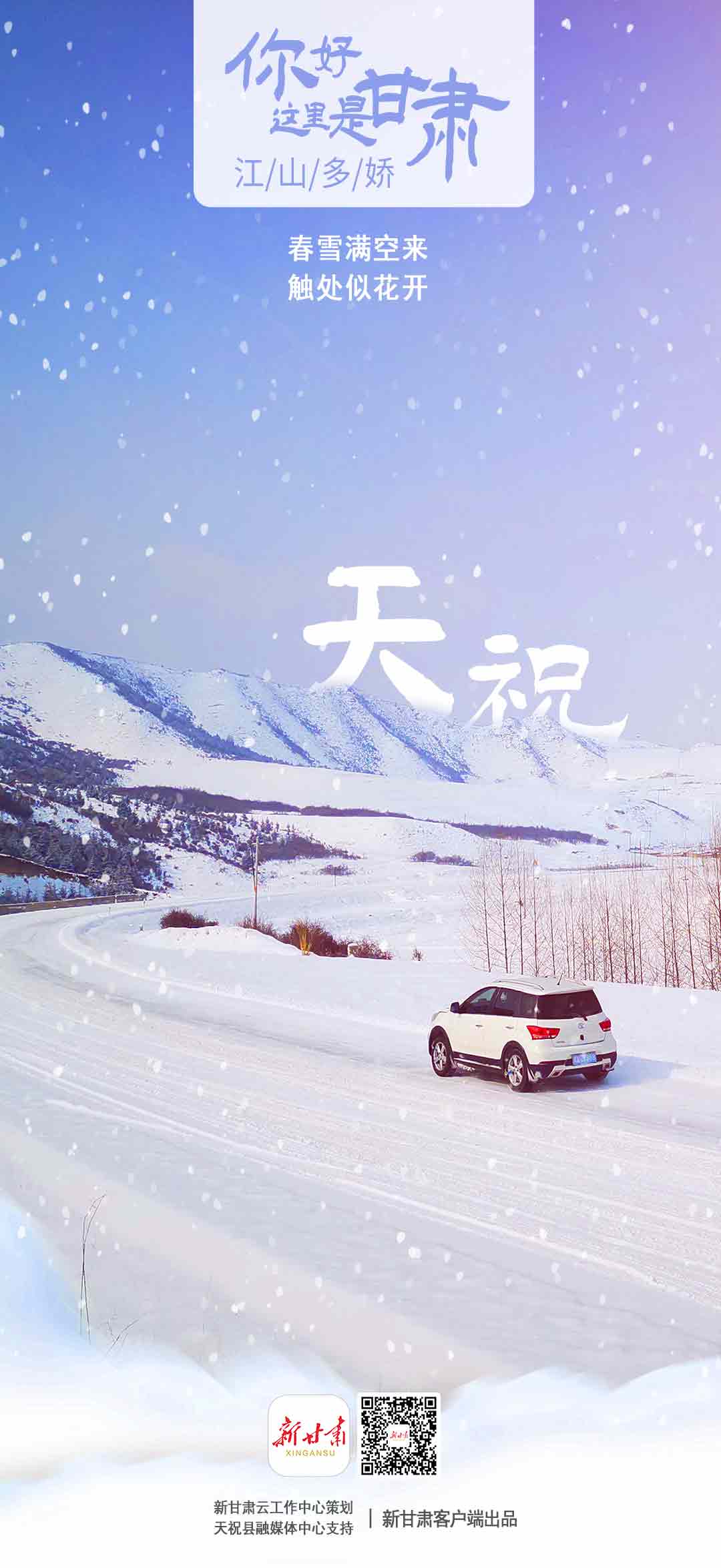 新甘肅客戶端新甘肅雲工作中心利用甘肅省融媒體省級技術平臺“新甘肅雲”的技術優勢,推出【你好,這裡是甘肅——江山多嬌】系列海報,集中表達了“瑞雪兆豐年”的美好寓意,激勵著廣大隴原兒女在新的一年裡以嶄新的面貌和奮進的姿態昂首新徵程。每張海報上的二維碼均關聯著對應縣(區)相關新聞。歡迎大家長按二維碼進入看詳情。