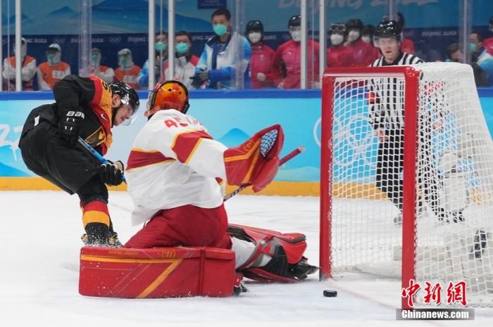 2月12日,北京2022年冬奧會男子冰球小組賽在北京國家體育館舉行。中國隊(白)以2:3負於德國隊。 中新社記者 崔楠 攝