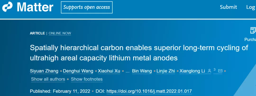 該項工作以“Spatially Hierarchical Carbon Enables Superior Long-Term Cycling of Ultrahigh Areal Capacity Lithium Metal Anodes”為題於近日發表在Matter上,第一作者為國家奈米科學中心博士研究生張思遠,通訊作者是李祥龍研究員。感謝王斌研究員、智林傑研究員對上述工作的幫助。該研究得到國家自然科學基金委、中科院等的支援。