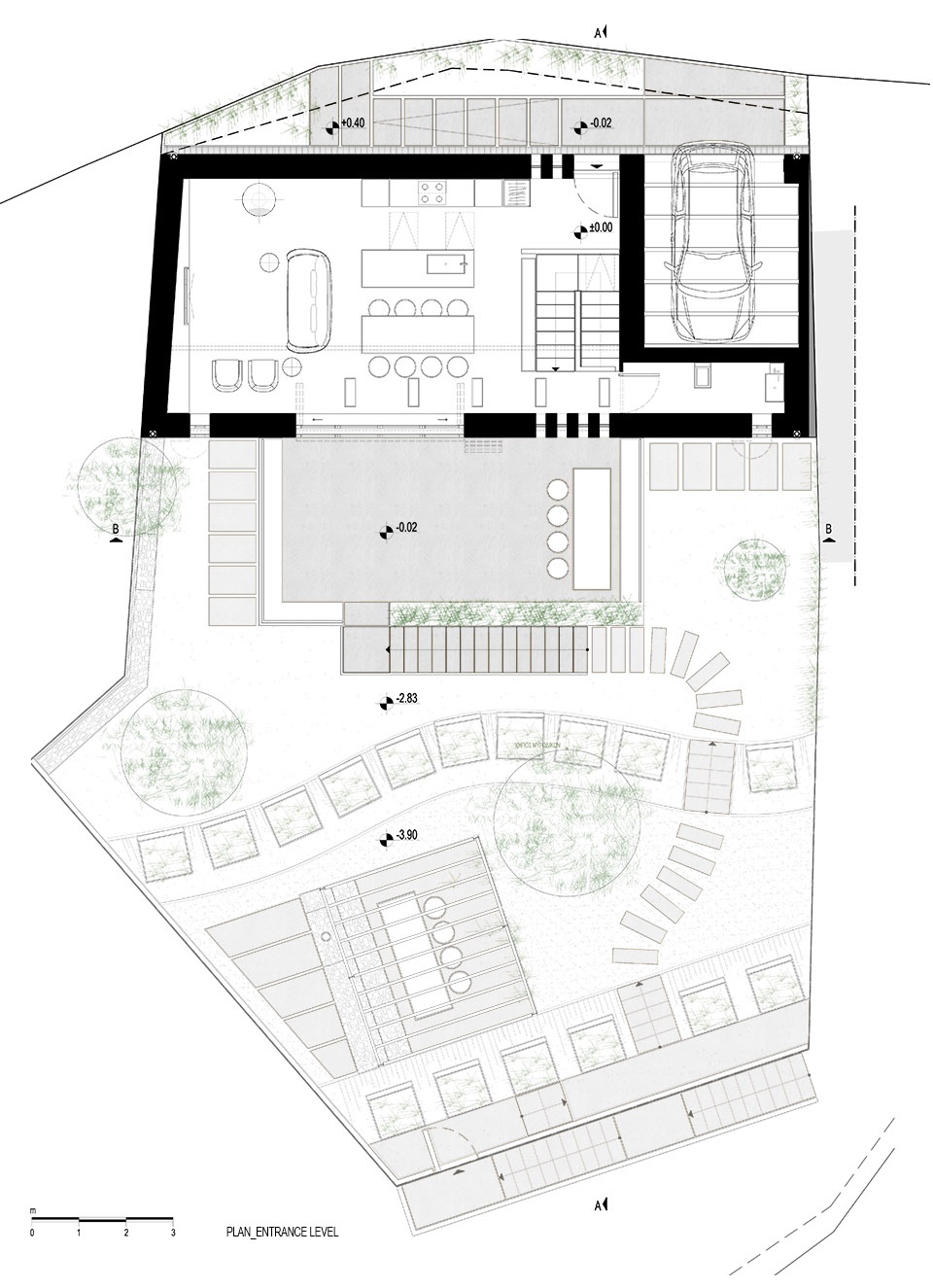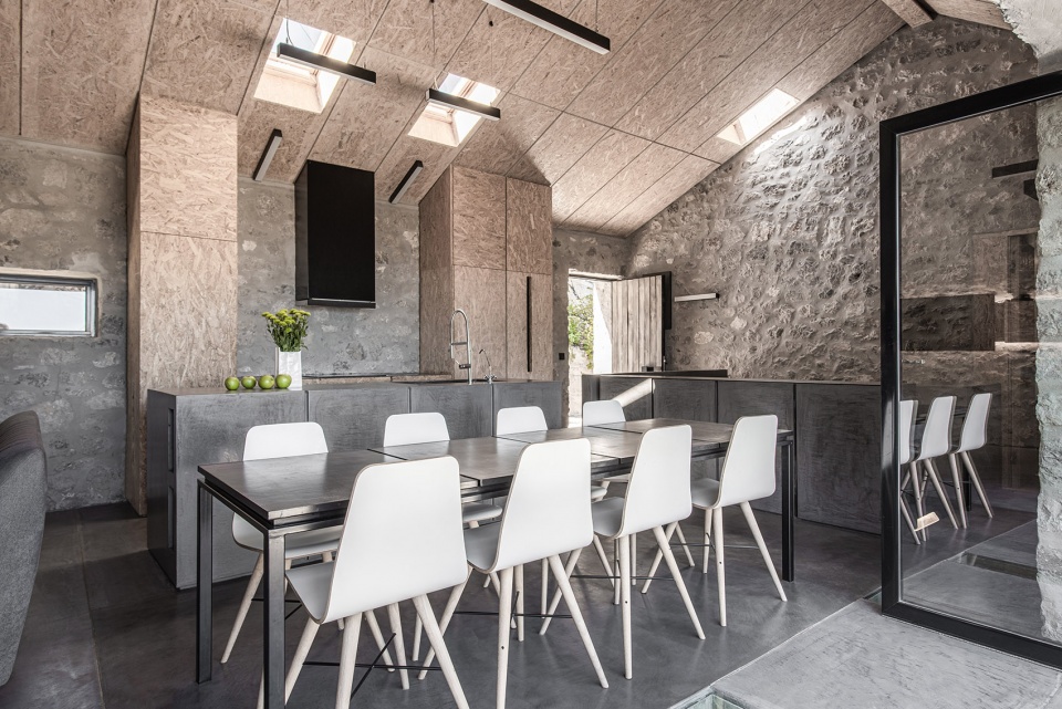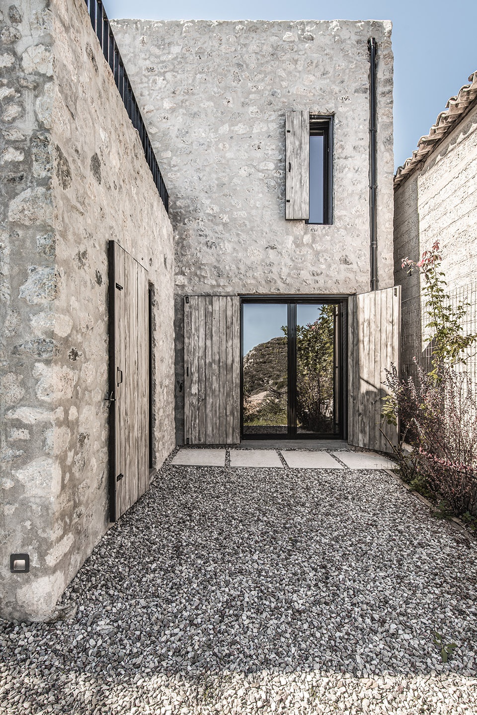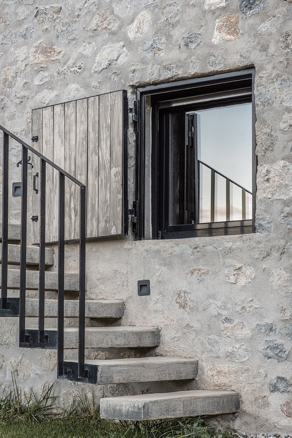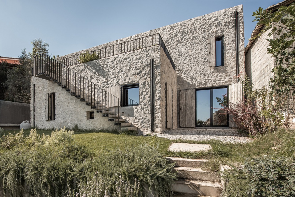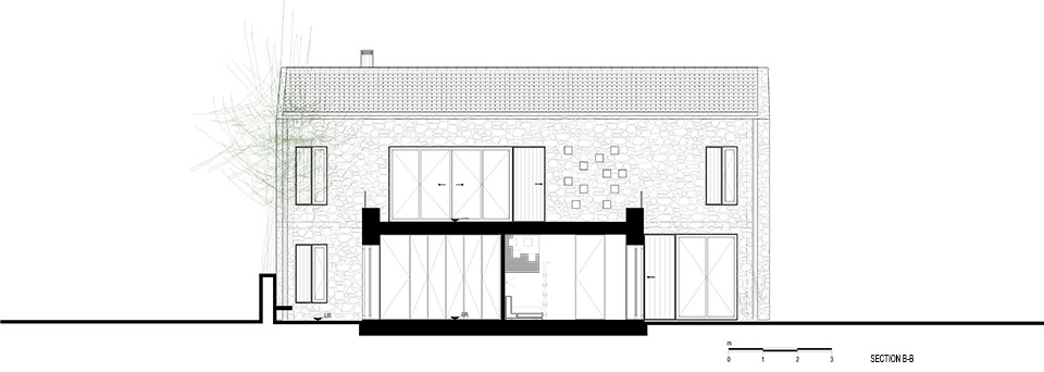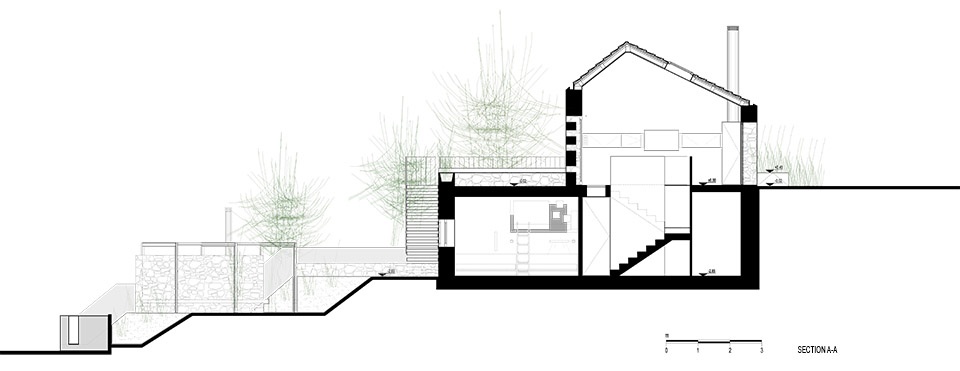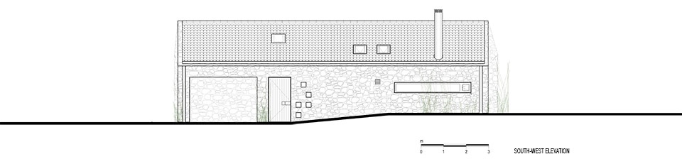 住宅坐落在斜坡上,6米的高差使建築師決定將這座住宅打造成一棟低矮、謙遜、如馬廄一般的石造建築。從街道一側看,住宅巧妙地融入鄉村環境;而從花園一側看,二層的建築體量拔地而起,創造出充足的住宅空間與強而有力的存在感。