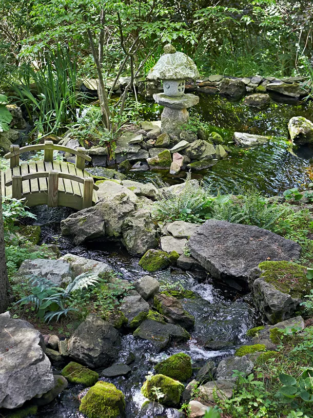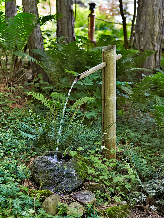 這裡的陰影規則;觀葉植物茂盛而大膽。由山茱萸、紫荊花和日本楓樹、巨大的蜂鬥菜、盾葉羅傑氏菌、鴕鳥蕨和各種玉簪和落新婦組成的樹冠覆蓋著陡峭的陡坡山坡,會唱歌的景象。日本森林草、日本畫蕨,以及夾在岩石、日本燈籠和其他亞洲雕塑之間的苔蘚,突出了更私密的區域。