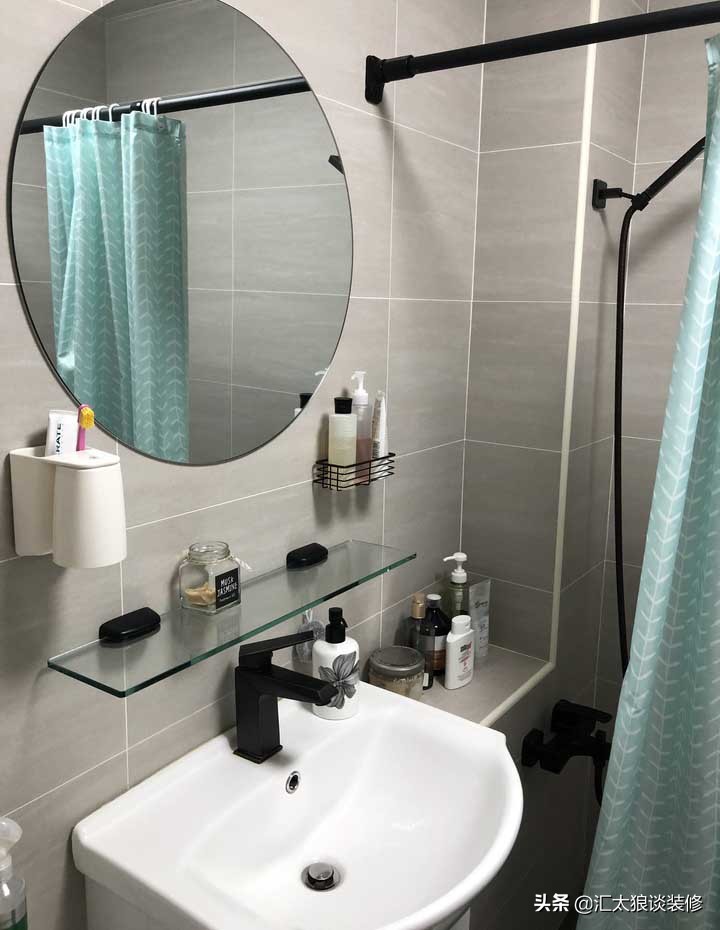 衛生間裡,除了牆上的化妝鏡,以及水龍頭和蓮蓬頭我給換了,又另外給配了個浴簾外,其它的,都是前房主弄好的。