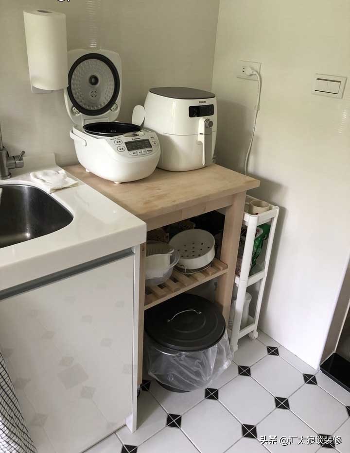 廚房這邊,除了多了一些日常生活用品外,還額外添置了兩個置物架,將櫥櫃旁邊原本用來放冰箱的空間給利用起來了。