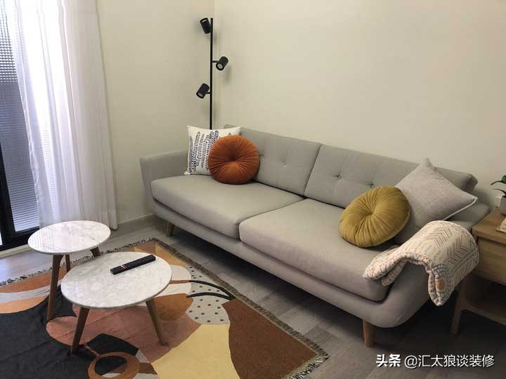 沙發選擇了淺灰色的布藝款,搭配白色的大理石茶几、實木藤編邊桌和白色的紗簾,舒適隨性,還有種很文藝的調調,來過我家的人,都說裝修效果不錯。