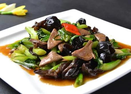 黑木耳泡發洗淨撕朵。豬肝洗淨切薄片,在水澱粉中抓芡均勻,在熱水中焯一下。將豬肝下入八成熱的油鍋中,加料酒,蔥末,薑絲,精鹽煸炒至熟,倒出。鍋留底油,用旺火將木耳炒至亮滑透香,倒回豬肝,加味精,香油炒勻即成。