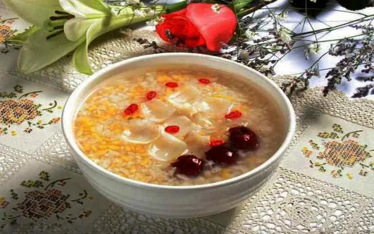 紅棗20枚、蓮子15克、大米100克,水適量。將紅棗、蓮子、大米洗淨後加入適量清水,旺火煮沸,再改用小火熬煮成粥,食用。