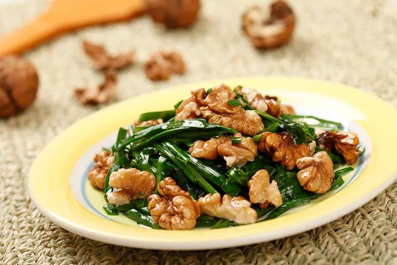 核桃仁用麻油炒香,韭菜洗淨切段,入油鍋炒熟,加鹽、味精調味後,放桃仁炒勻即成。