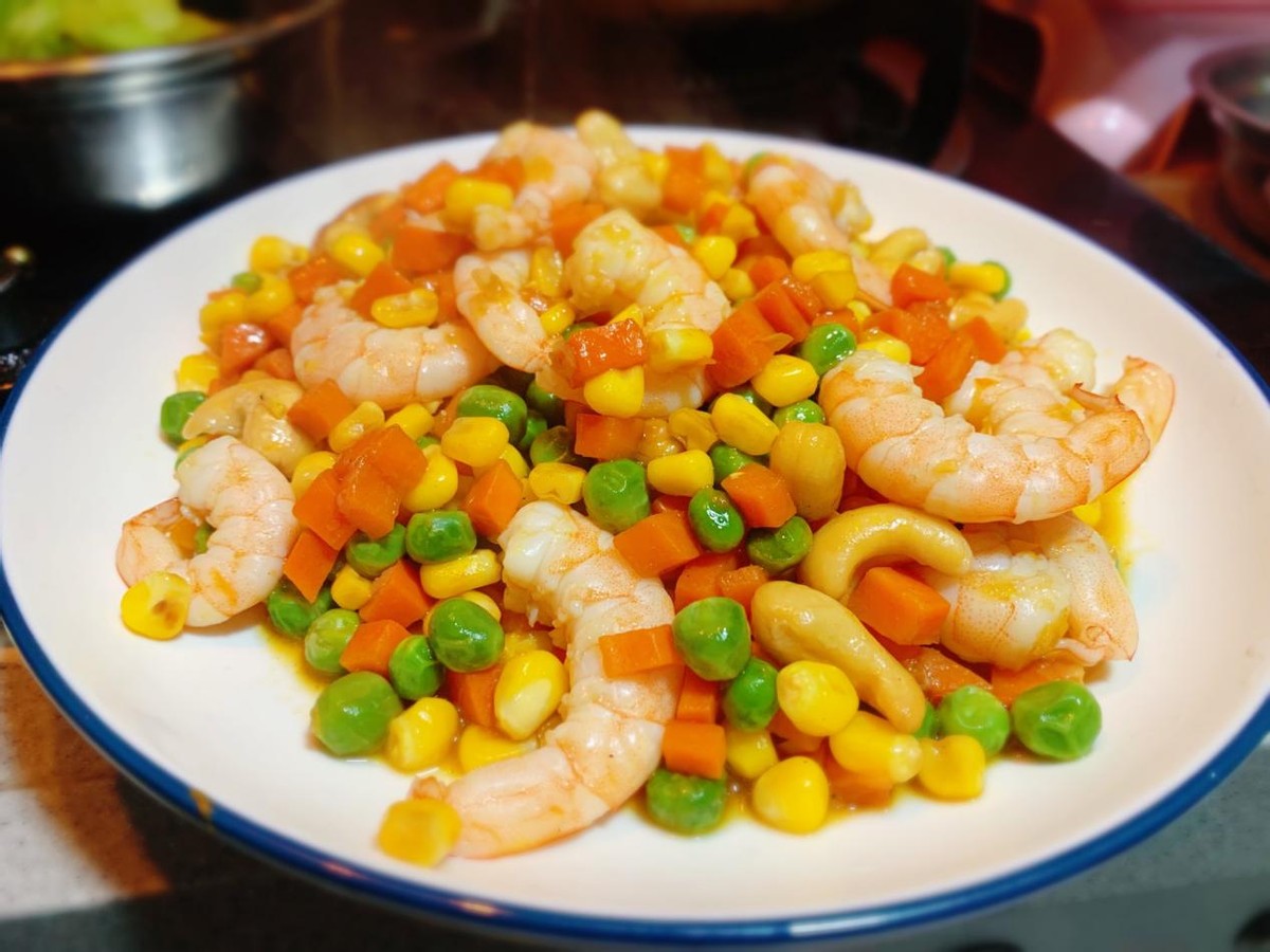 【烹飪食材】:蝦仁400克,玉米粒200克,豌豆200克,紅菜椒100克,鹽一勺,雞精半勺,蔥花一勺,黑胡椒粒一勺