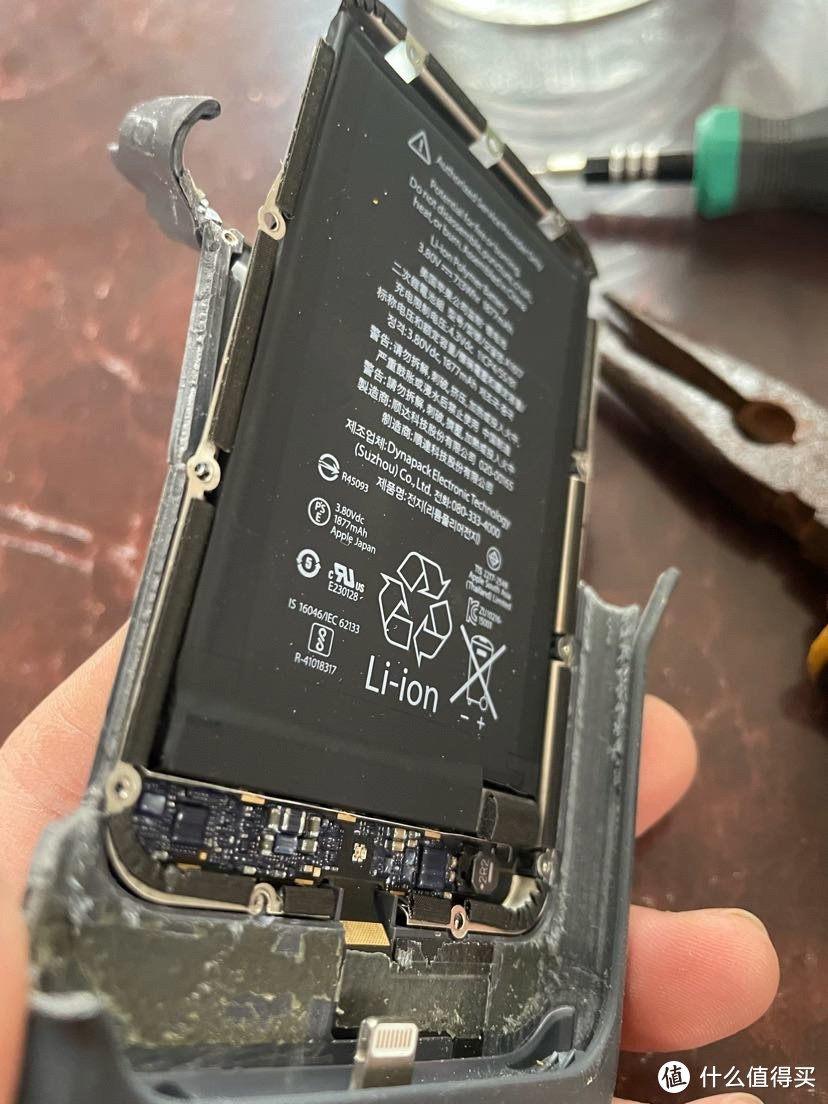 買的是iPhone6s的外界電池,注意剛拿來的時候插進iPhonese的菊花裡面不充電,因為大小不合適,得拆