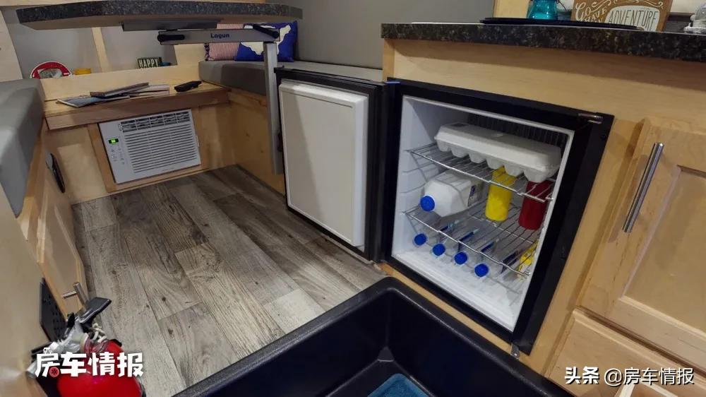 車廂中部是全車的廚房區域,雖然車內空間有限,但是廚房操作檯的面積還是表現的不錯,帶有基礎的水槽、燃氣灶、車載冰箱和儲物空間,可以滿足日常的需求,而在臨近乘客門的地方還設計了一處功能區,配有電磁爐和全車的水電控制面板,以及開放式的儲物空間。