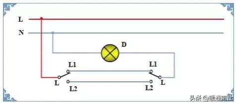 雙控燈電路:兩個開關控制1盞燈,需要單聯雙控(又稱單刀雙擲)開關2只。開關有3個接線孔,其中L是公共端,接電源火線進線和開關至電燈的火線出線,L1和L2是開關的出線端,是兩個開關的連線線。實物示意圖如圖一所示。