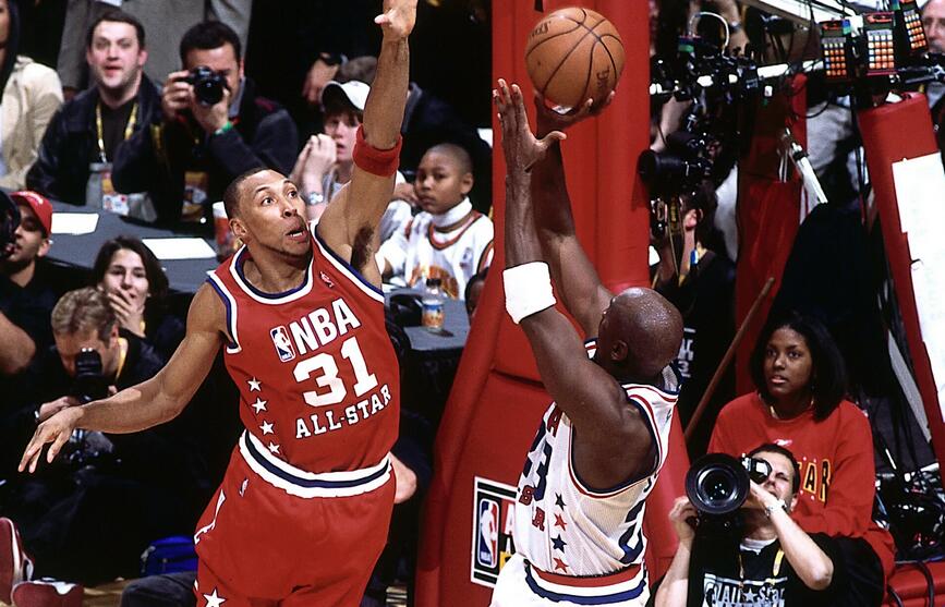 這是2003年全明星流傳最廣的一球,東部隊手握最後一攻的機會,基德持球面對科比的防守,比賽還剩不到10秒時把球交到了喬丹的手中。這次面對馬里昂,喬丹特意調高了弧度。馬里昂多年後回憶稱,這一球自己已經盡了最大的努力。讚美的發言準備好了,碩大的獎盃擺出來了,這段情節像極了1998年總決賽的第六場。那年喬丹晃倒拜倫-拉塞爾,命中鎖定第六冠的準絕殺,這次又讓他裝到了。