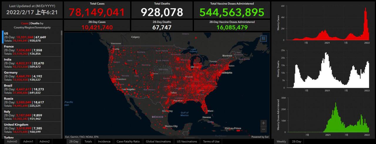 (觀察者網訊)根據美國約翰斯·霍普金斯大學統計資料,截至北京時間2022年2月17日6時21分,美國新冠肺炎累計確診病例達到78149041例,累計死亡病例達到928078例。在過去約23小時裡,美國新增確診病例158419例,新增死亡病例4041例。