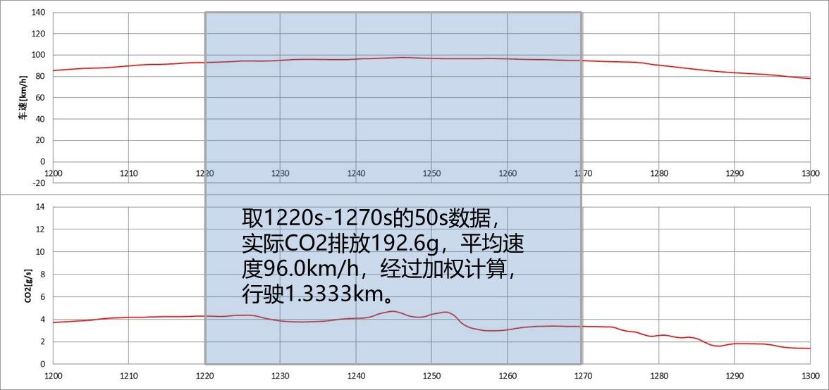 取1220s-1270s的50s資料,實際CO2排放192.6g,平均速度96.0km/h,經過加權計算,行駛1.3333km。計算碳排放為144g/km,換算成油耗為5.33L/100km。