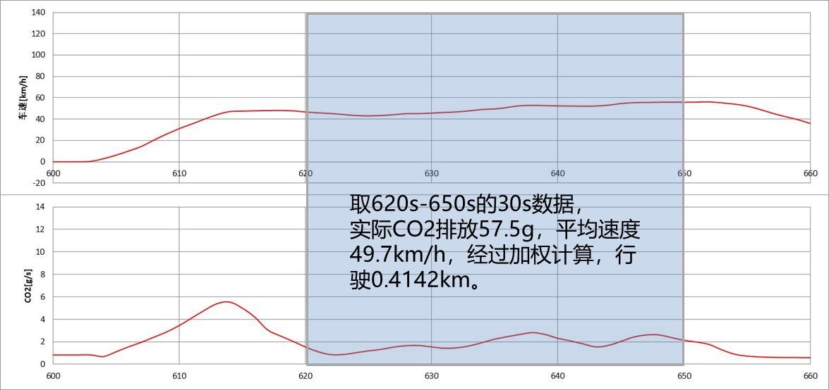 取620s-650s的30s資料,實際CO2排放57.5g,平均速度49.7km/h,經過加權計算,行駛0.4142km。計算碳排放為138.8g/km,換算成油耗為5.14L/100km。